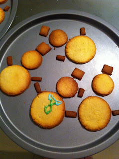 All the bag of coloured icing. Colourful eh? We mixed "Egg Yellow" and "Blue" to form the green colour above. The fun begins after you mould and cut your dough into different shapes (Circles of 2 sizes, squares and rectangles). Let the decorating begin!